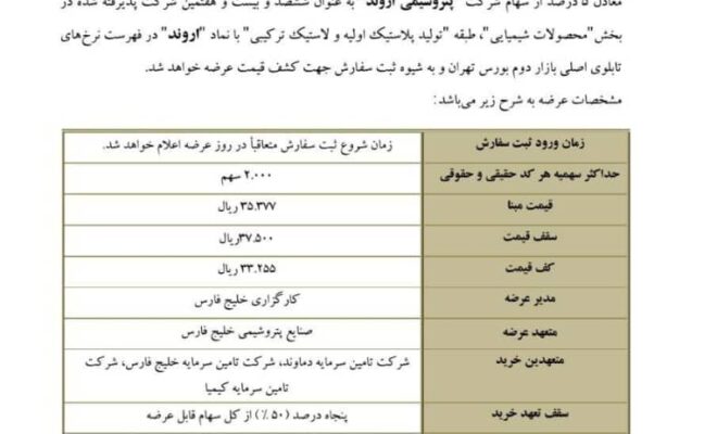 به گزارش تریتا نیوز به نقل از روابط عمومی شرکت صنایع پتروشیمی خلیجفارس، پنج درصد از سهام شرکت پتروشیمی اروند به عنوان ششصد و بیست و هفتمین شرکت پذیرفته شده در بورس در بخش محصولات شیمیایی در فهرست نرخهای تابلوی اصلی بازار دوم بورس تهران و به شیوه ثبت سفارش جهت کشف قیمت عرضه خواهد شد.