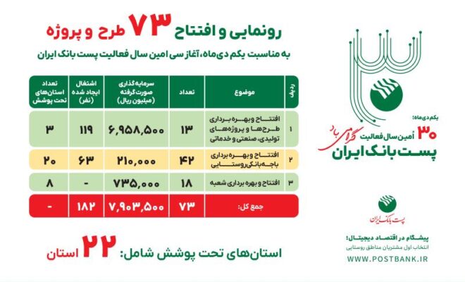 بهرهبرداری از ۷۳ طرح و پروژه پستبانک ایران همزمان با سیامین سال فعالیت