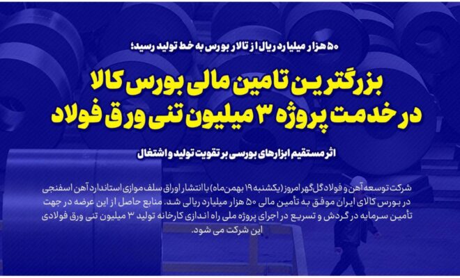 ۵۰ هزار میلیارد ریال از تالار بورس به خط تولید رسید؛ بزرگترین تامین مالی بورس کالا در خدمت پروژه ۳ میلیون تنی ورق فولاد/ اثر مستقیم ابزارهای بورسی بر تقویت تولید و اشتغال