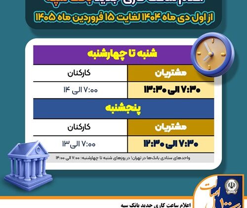 تریتا نیوز /ساعت کاری جدید بانک سپه از اول دیماه ۱۴۰۴ لغایت ۱۵ فروردینماه ۱۴۰۵ بر اساس بخشنامه سازمان اداری و استخدامی کشور و اطلاعیه شورای ...
